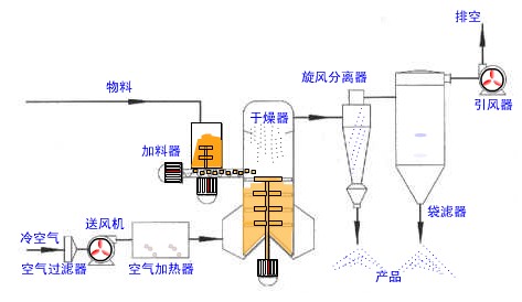 旋轉(zhuǎn)閃蒸干燥機(jī)的干燥系統(tǒng)主要由空氣過(guò)濾器、加熱器、加料器、熱風(fēng)分布器、閃蒸干燥主機(jī)、分級(jí)室、旋風(fēng)分離器、布袋除塵器以及引風(fēng)機(jī)等主要設(shè)備及附件構(gòu)成。